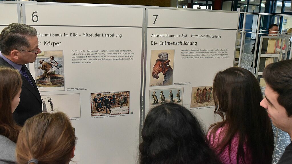 In ihrer Ansprache betonte Frau Wendt nicht nur die Wichtigkeit der gesellschaftlichen Partizipation in einer Demokratie, die man nicht als selbstverständlich, sondern als schützenswert erachten sollte. Vor allem unterstrich sie– in Anlehnung an ein bekanntes Zitat der Holocaust-Überlebenden Margot Friedländer– den Wert der Menschlichkeit im Kampf gegen Diskriminierung und im gesellschaftlichen Umgang. Im Anschluss griff Herr Dr. Nitschke versiert den Inhalt der Ausstellung auf und rückte historische Ursprünge von Antisemitismus in den Mittelpunkt seiner Rede.