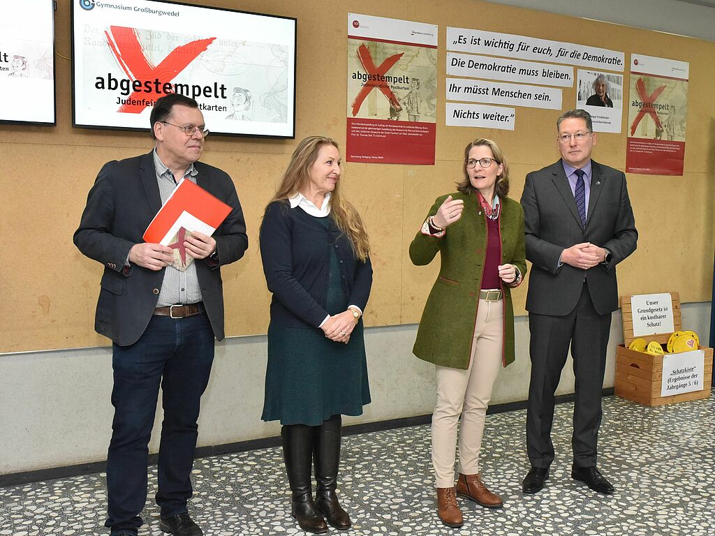 Am Dienstag, den 26. November 2024 war es ab 8:30 Uhr so weit: die in unserer Pausenhalle befindliche Wanderausstellung „Abgestempelt“, welche sich mittels historischer Dokumente mit den Themen Antisemitismus, Vorurteilen und Diskriminierung beschäftigt, wurde durch unseren Schulleiter Robert Baberske offiziell eröffnet. Besonders erfreut waren wir, dass sich Frau Bürgermeisterin Ortrud Wendt, Herr Friedrich als Fachbereichsleiter Gesellschaftslehre und Religion und in Vertretung des IGS-Schulleiters Herr Schinze-Gerber, Mitglieder des Schülervertretung sowie viele interessierte Schülerinnen und Schüler und ihre Lehrkräfte zu diesem Anlass eingefunden haben.