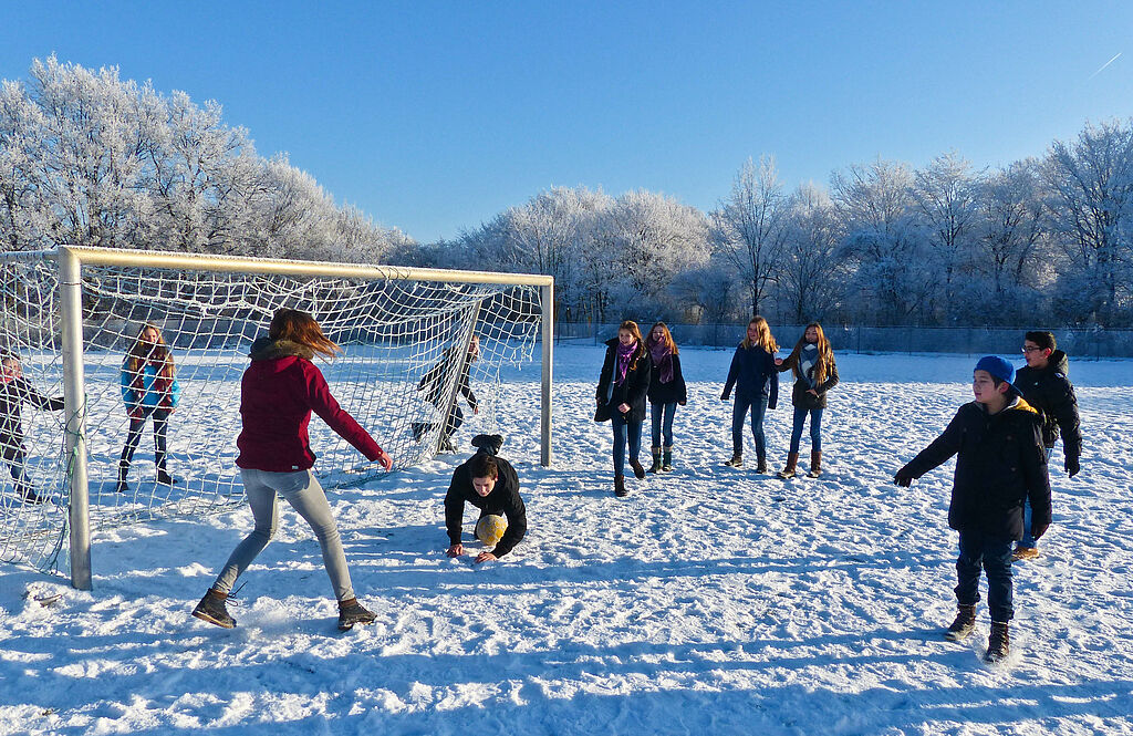 Pisa-Studie hin oder her – wenn Petrus sich von seiner sonnig-winterlichen Seite zeigt, blicken die Schülerinnen und Schüler schon mal häufiger aus dem Fenster hinaus ins Freie. Statt Vokabeln zu lernen und dem Lehrer zuzuhören, wird insgeheim die Zeit nach dem Unterricht geplant. Und dann gibt es kein Halten mehr und man tobt sich, wie hier die Klasse 7 LF2, draußen so richtig aus. Denn lange wird der Schnee nicht mehr liegen bleiben: Regen hat sich angesagt.