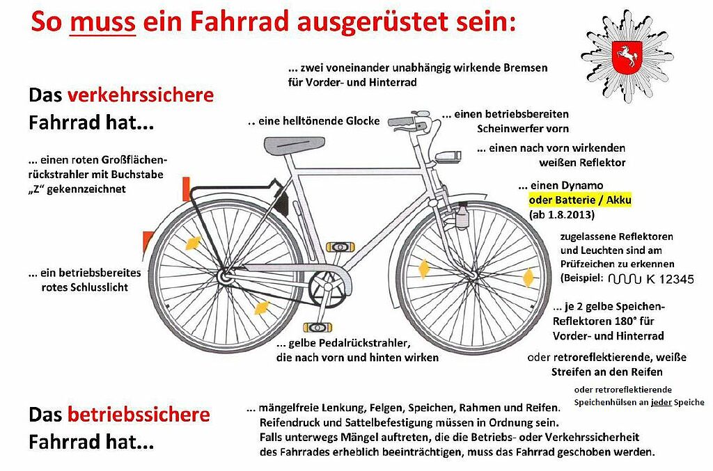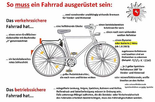 Im Winter liegt der Weg zur Schule wieder in der Dämmerungszeit. Wir möchten im Vorfeld darauf aufmerksam machen, dass durch die Polizei auch in dieser Zeit auf die Sicherheit der Fahrradfahrenden und E-Scooter Fahrenden geachtet wird. Dazu gehört u.a. die Kontrolle der lichttechnischen Einrichtung und ihrer Funktionalität. Wie ein Fahrrad gemäß der StVZO ausgerüstet sein muss, können Sie der Abbildung entnehmen.