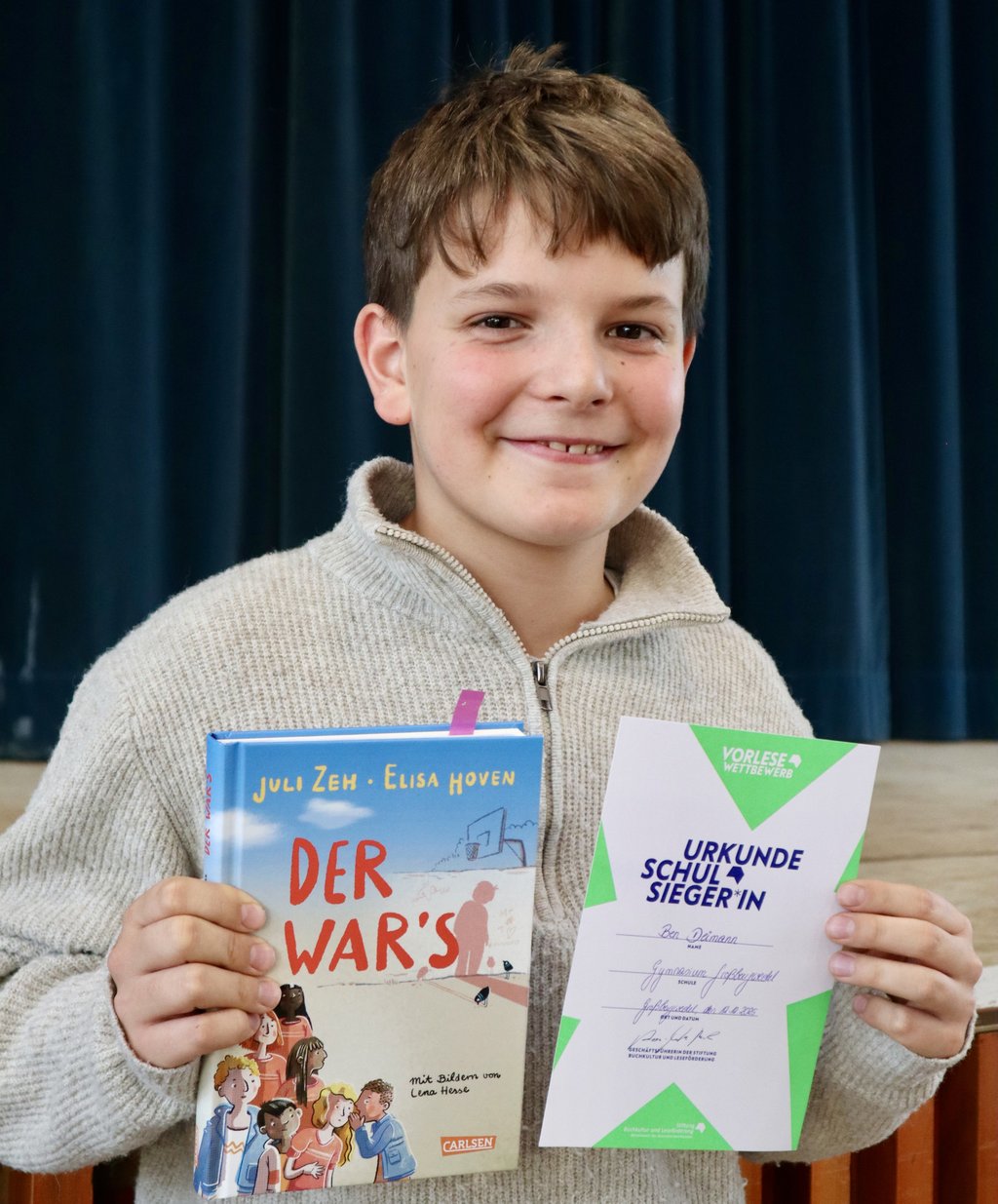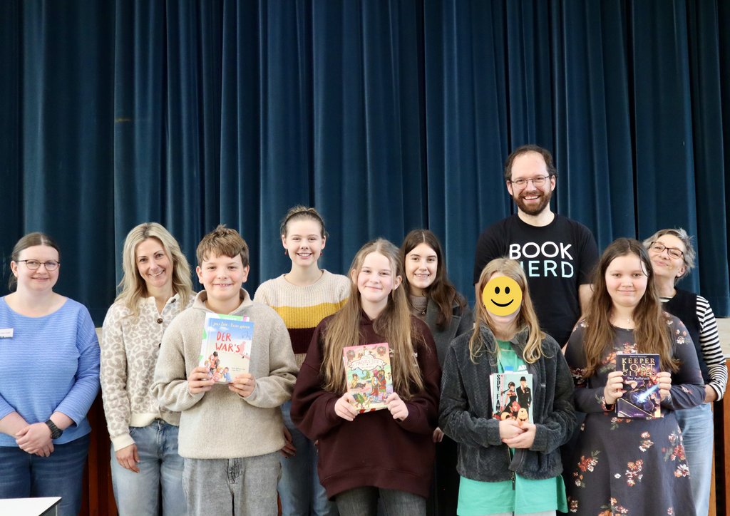 In der zweiten Runde mussten die Teilnehmenden dann aus einem Fremdtext lesen und auch hier machte sich die Jury fleißig Notizen. Anschließend zog sich diese zur Beratung zurück und die Schülerinnen und Schüler warteten gespannt in der Aula auf das Ergebnis. Nach intensiven Gesprächen kam die Jury schließlich zurück und verkündete freudig das knappe Ergebnis und damit den diesjährigen Schulsieger: Ben Deimann aus der 6D! Wir sagen herzlichen Glückwunsch und sind gespannt, wie es für ihn nun beim Kreisentscheid im Februar 2026 weitergeht!