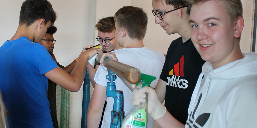 Unter dem Motto „Hau weg den Dreck!“ schrubbten am letzten Schultag am Gymnasium Großburgwedel alle Schülerinnen und Schüler und die Lehrer was das Zeug hielt. Es wurden geputzt, gefegt, poliert und sortiert. Die Klassen- und Fachräume wurden an den Stellen auf Vordermann gebracht, an denen die täglichen Putzkolonnen der Stadt berechtigterweise vorbeigehen. So wurden sogar die Sportgeräte in der Sporthalle von den Schülerinnen und Schülern inspiziert und bei Bedarf gesäubert.